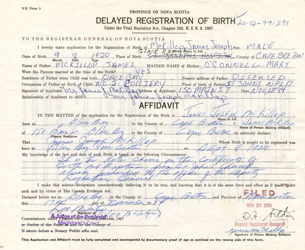 Signature of Applicant James Joseph McKillop Address of Applicant Glace Bay Date November 13, 1984