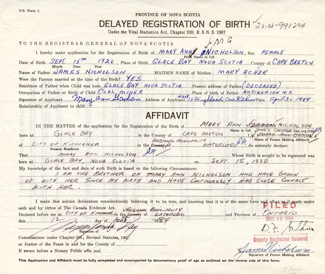 Date of Birth September 15, 1920 Place of Birth Glace BayCounty of Cape Breton
