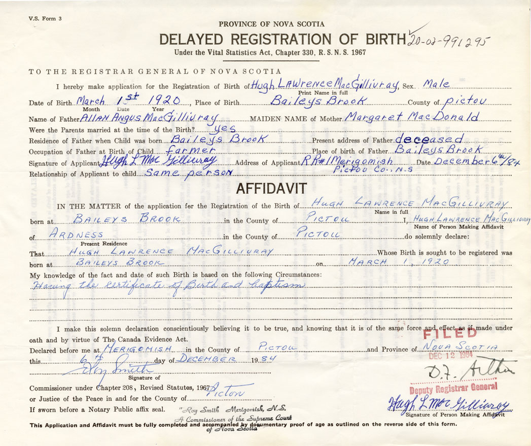 Signature of Applicant Hugh L. MacGillivray Address of Applicant Merigomish Date December 6, 1984
