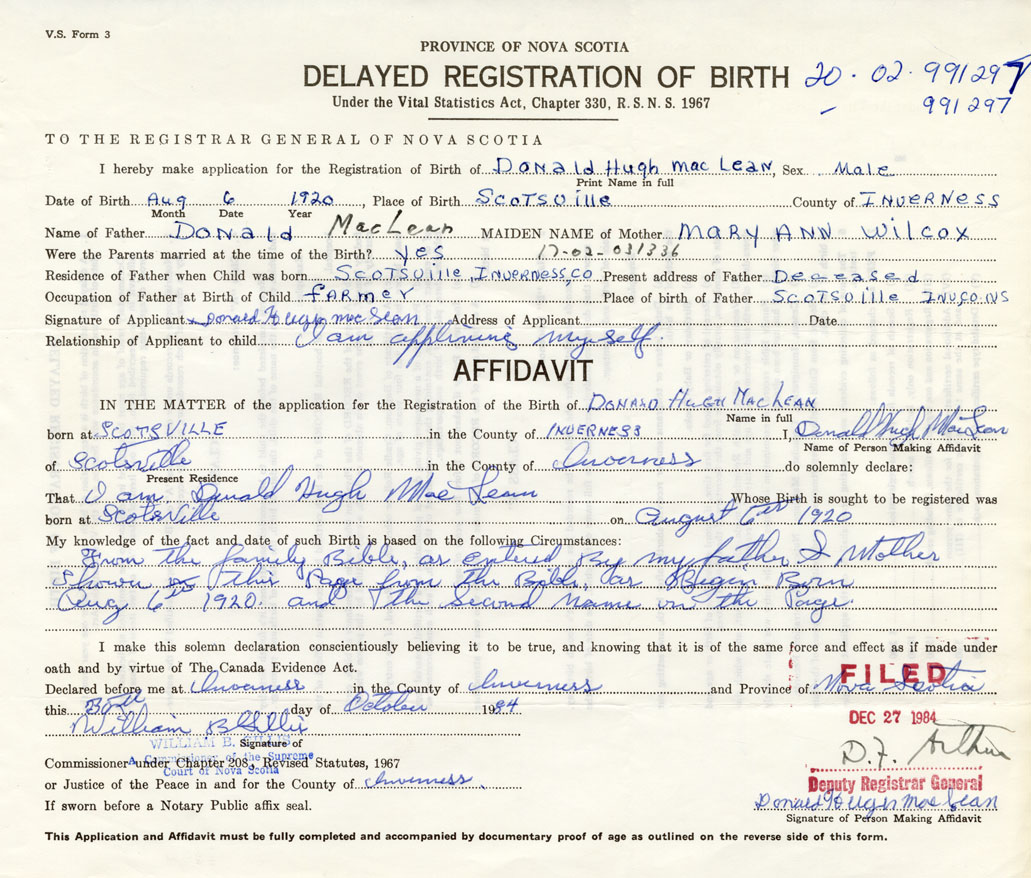 I hereby make application for the Registration of Birth of Donald HughMacLean Sex Male