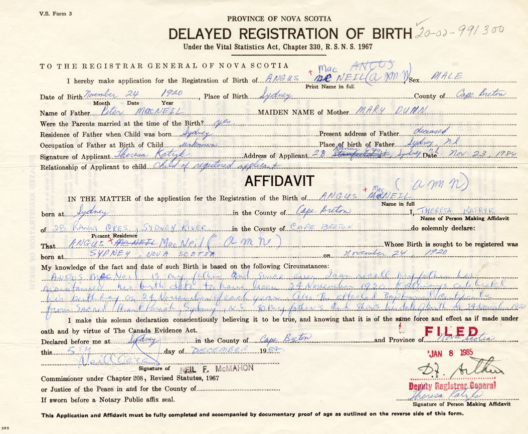 I hereby make application for the Registration of Birth of AngusMacNeil Sex Male