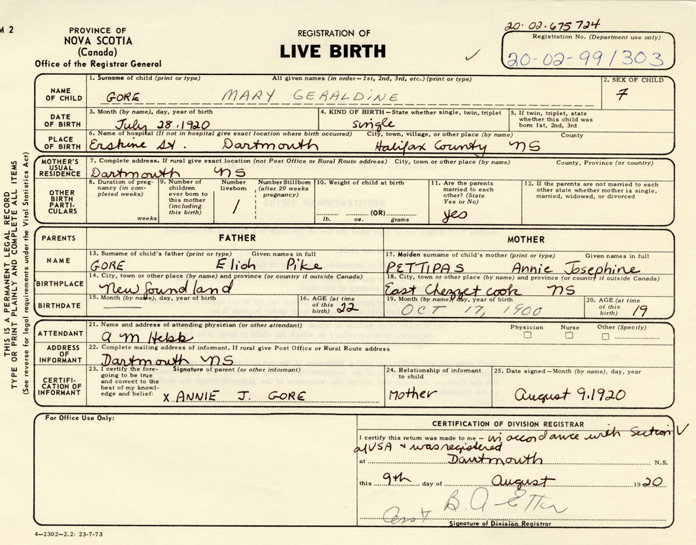 born at Dartmouth Halifax County on July 28, 1920