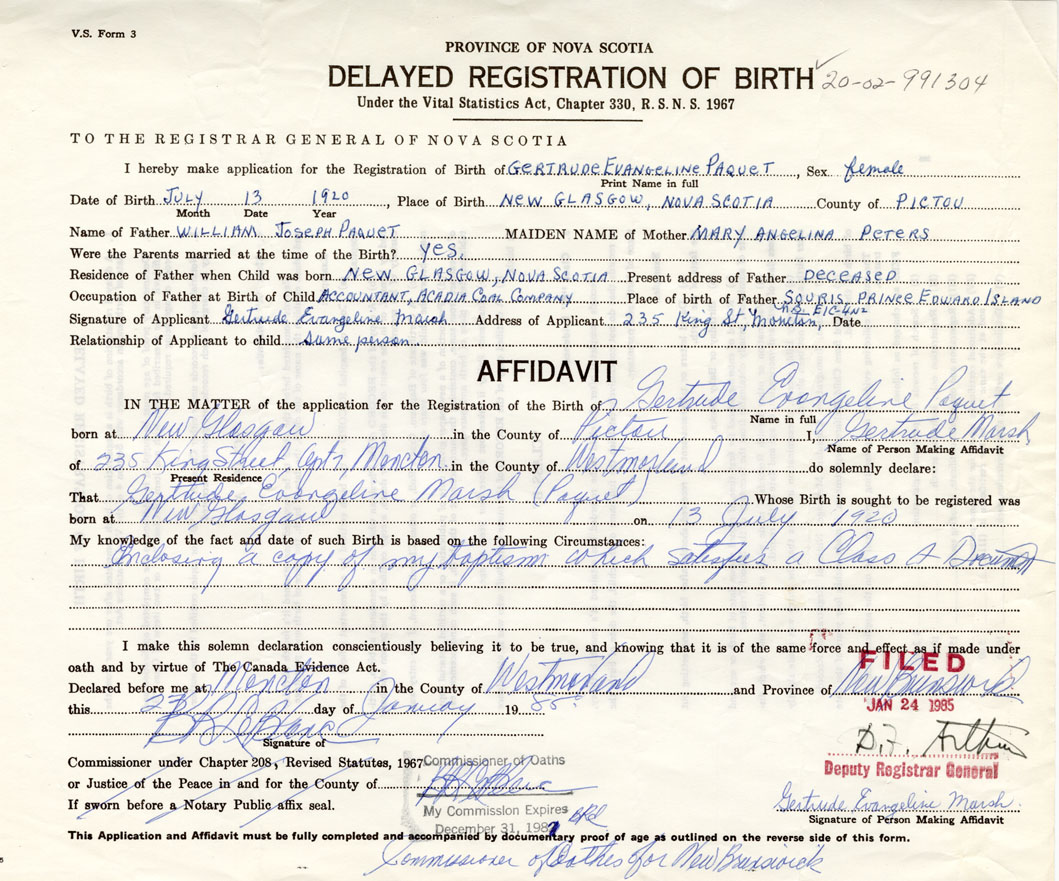 IN THE MATTER of the application for the Registration of the Birth of Gertrude EvangelinePaquet