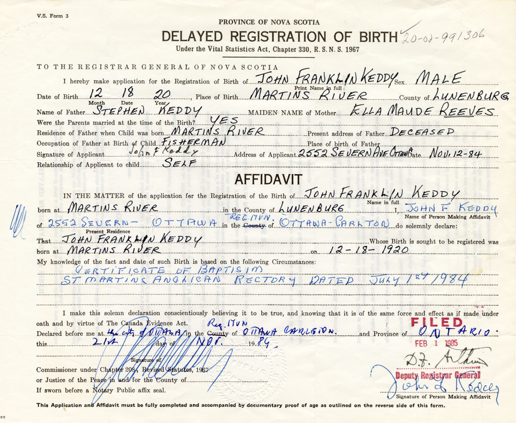 Date of Birth December 18, 1920 Place of Birth Martins RiverCounty of Lunenburg