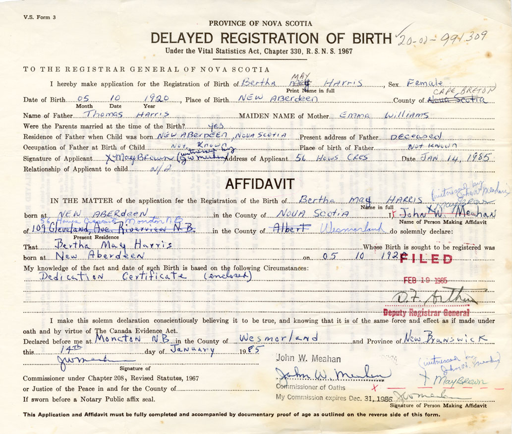 Date of Birth May 10, 1920 Place of Birth New AberdeenCounty of Cape Breton