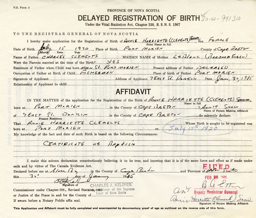 Date of Birth July 15, 1920 Place of Birth Port MorienCounty of Cape Breton