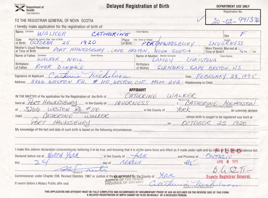 Date of Birth October 25, 1920 Place of Birth Port HawkesburyCounty of Inverness