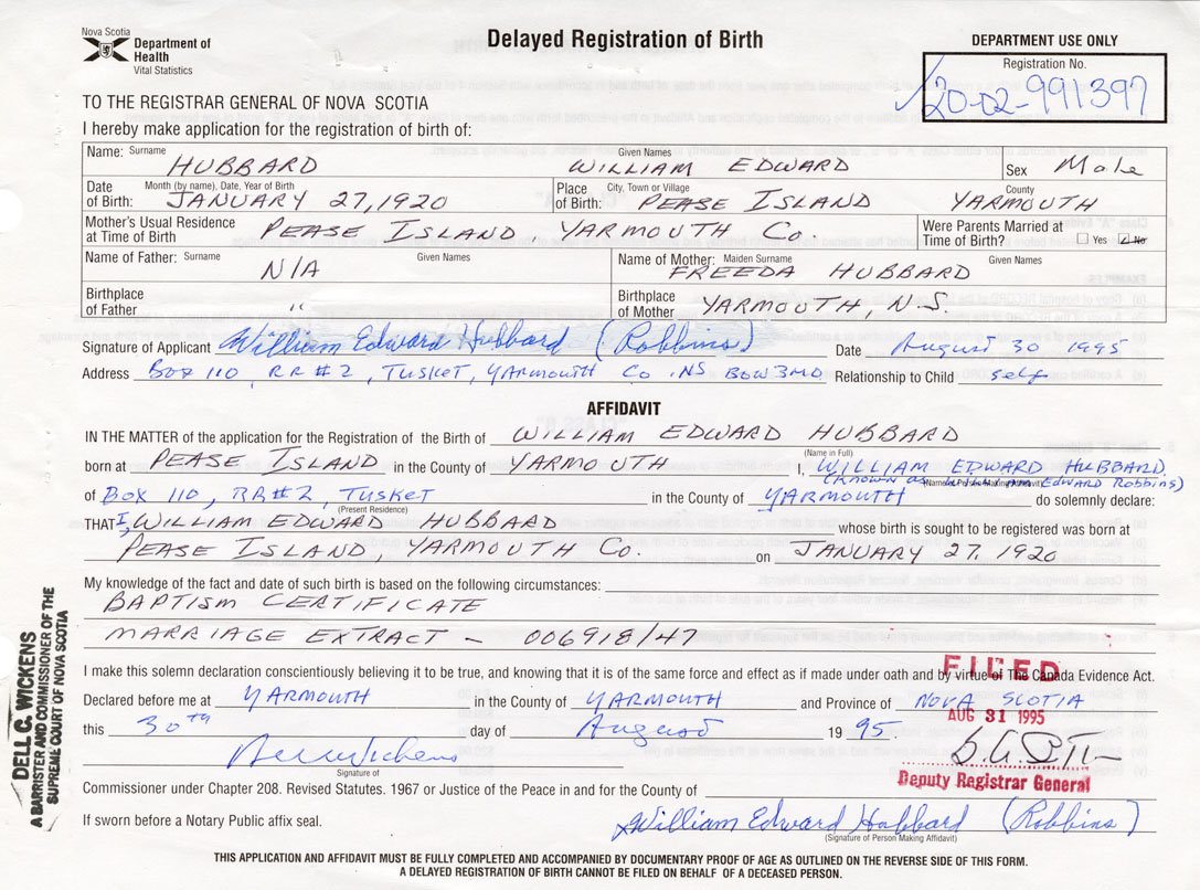 Date of Birth January 27, 1920 Place of Birth Pease IslandCounty of Yarmouth