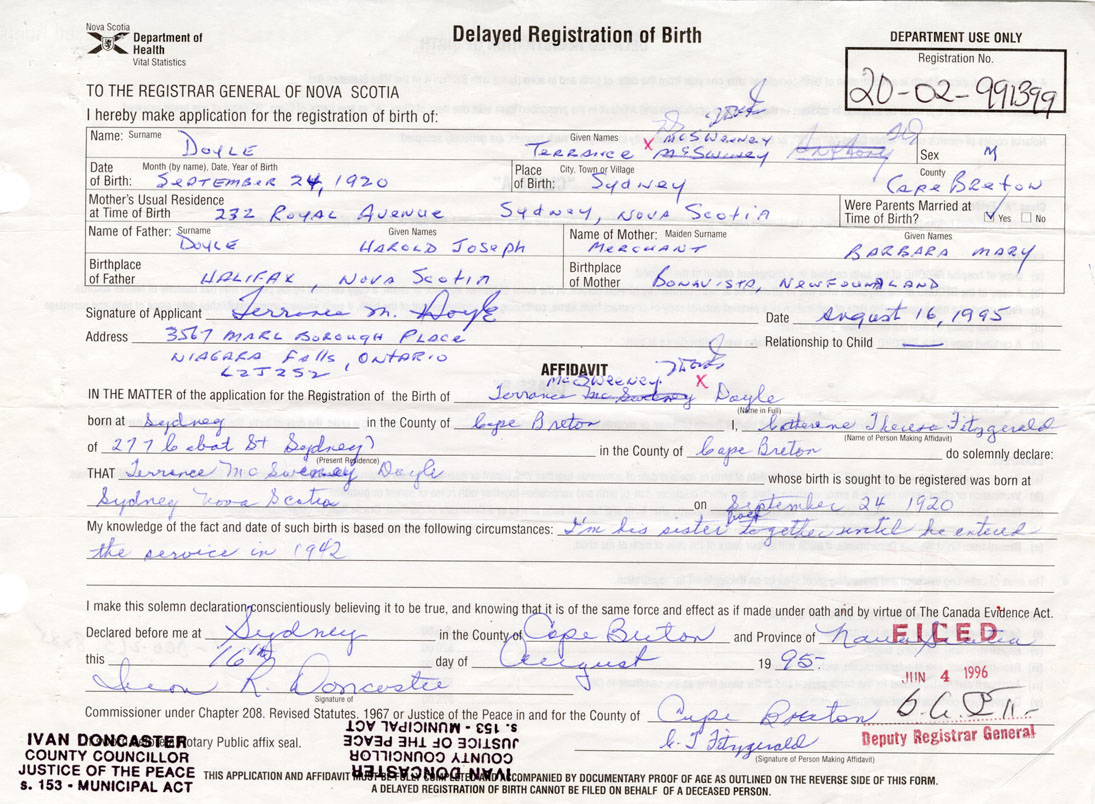 IN THE MATTER of the application for the Registration of the Birth of Terrance McSweeneyDoyle