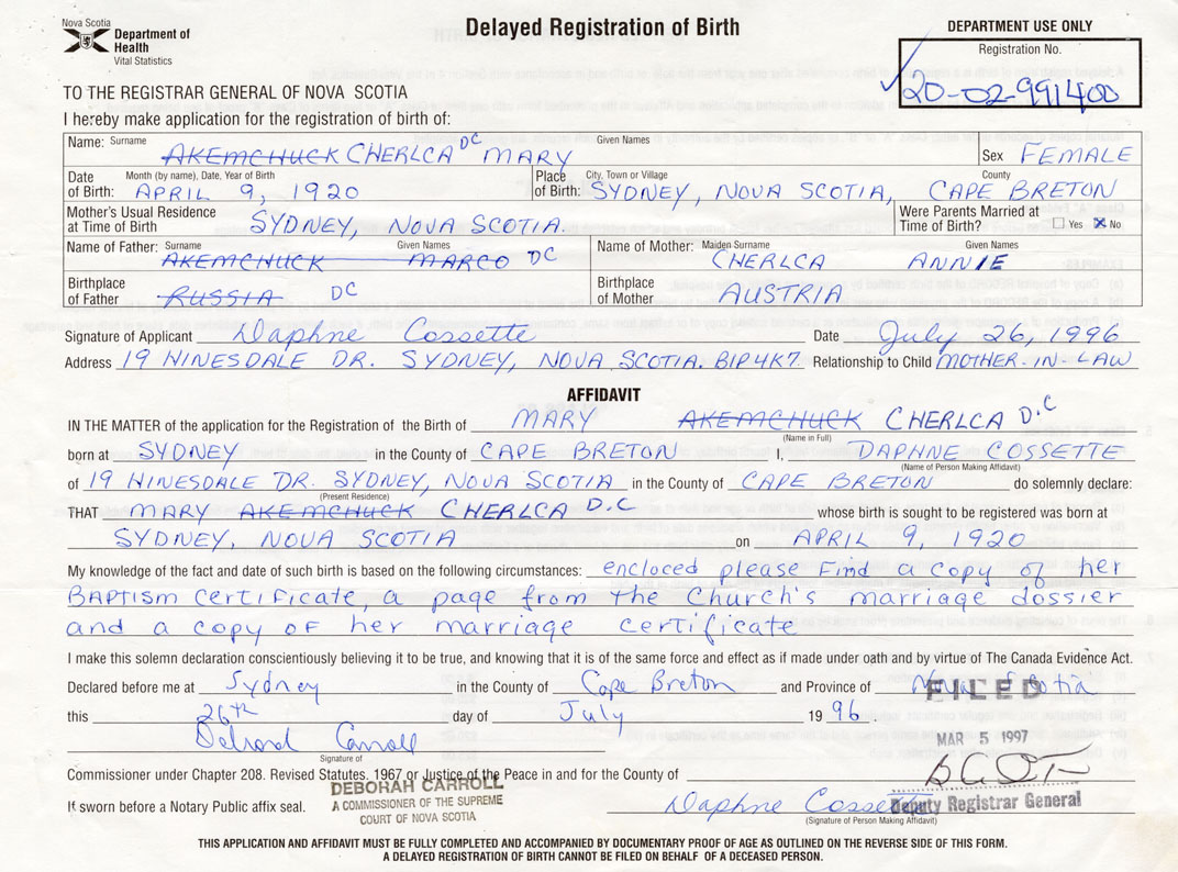 Date of Birth April 9, 1920 Place of Birth SydneyCounty of Cape Breton