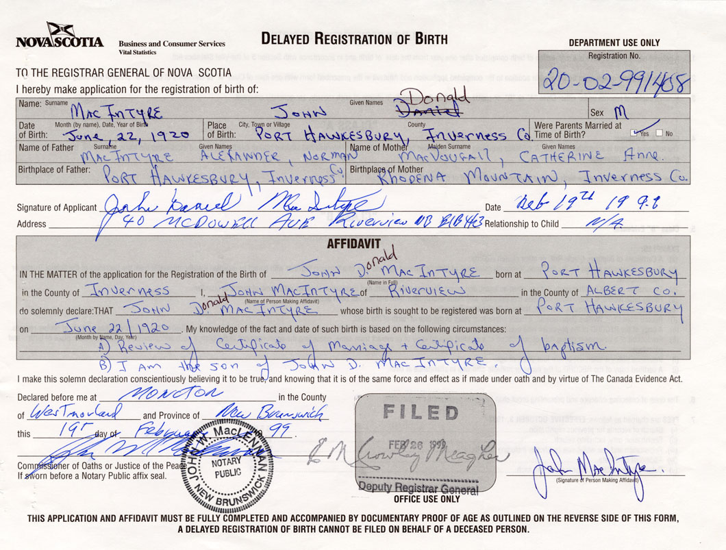 Name of Father Alexander Norman MacIntyre MAIDEN NAME of Mother Catherine Anne MacDougall