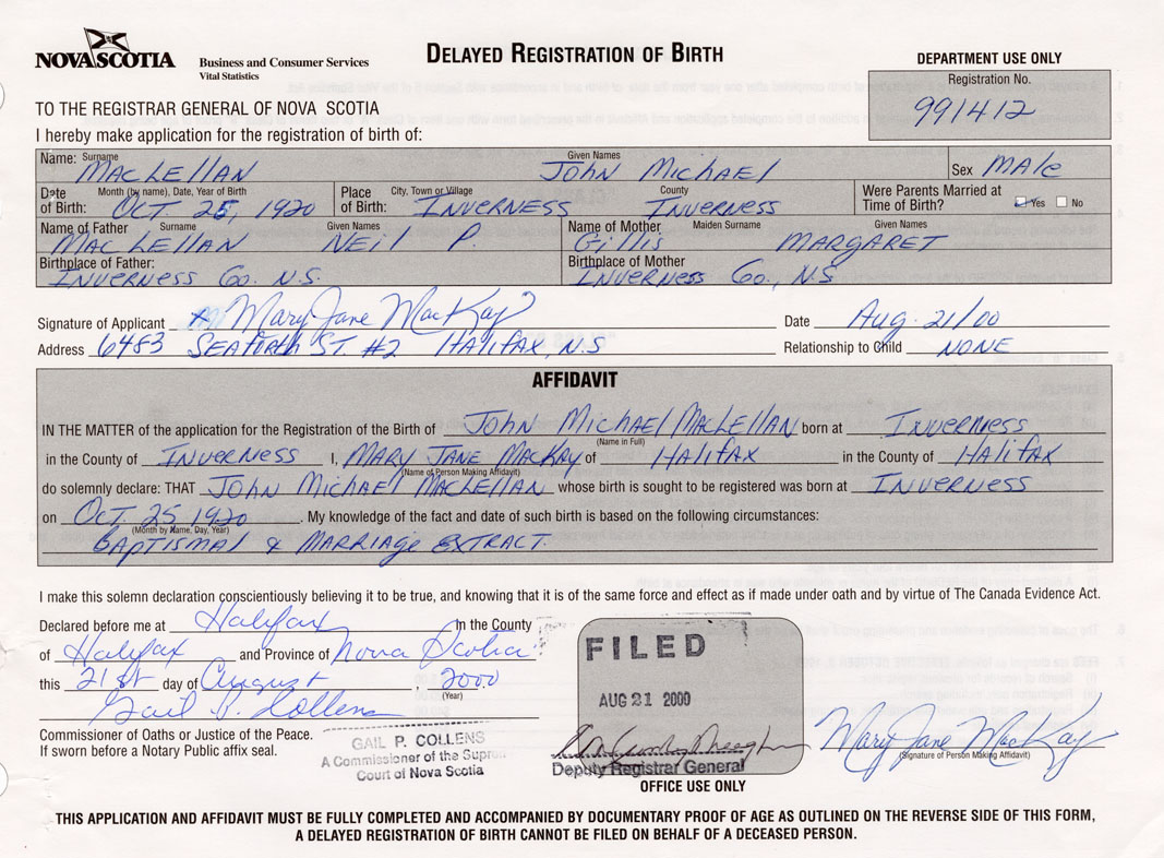 Name of Father John Michael MacLellan MAIDEN NAME of Mother Margaret Gillis