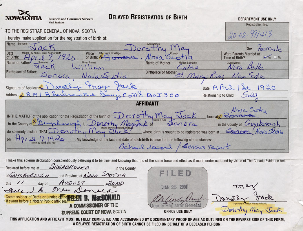 IN THE MATTER of the application for the Registration of the Birth of Dorothy MayJack