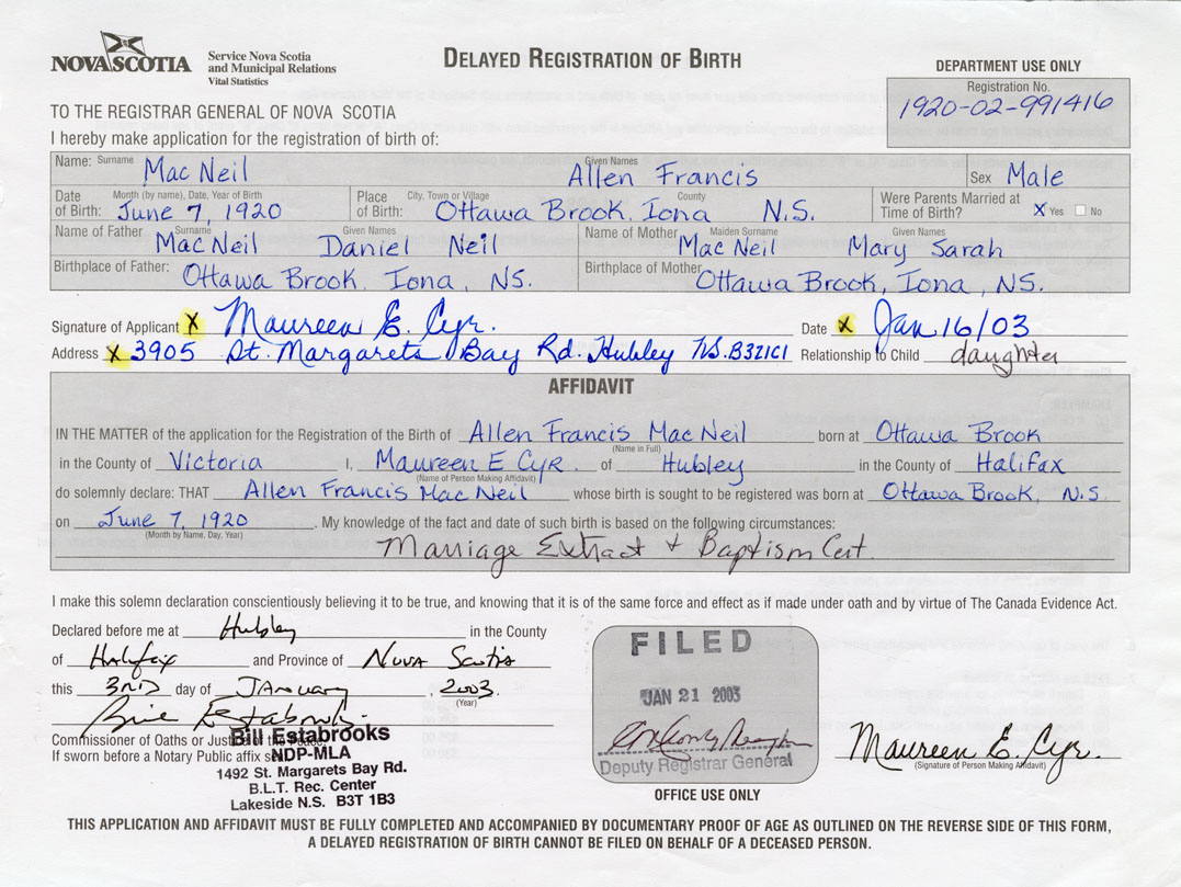 I hereby make application for the Registration of Birth of Allen FrancisMacNeil Sex Male