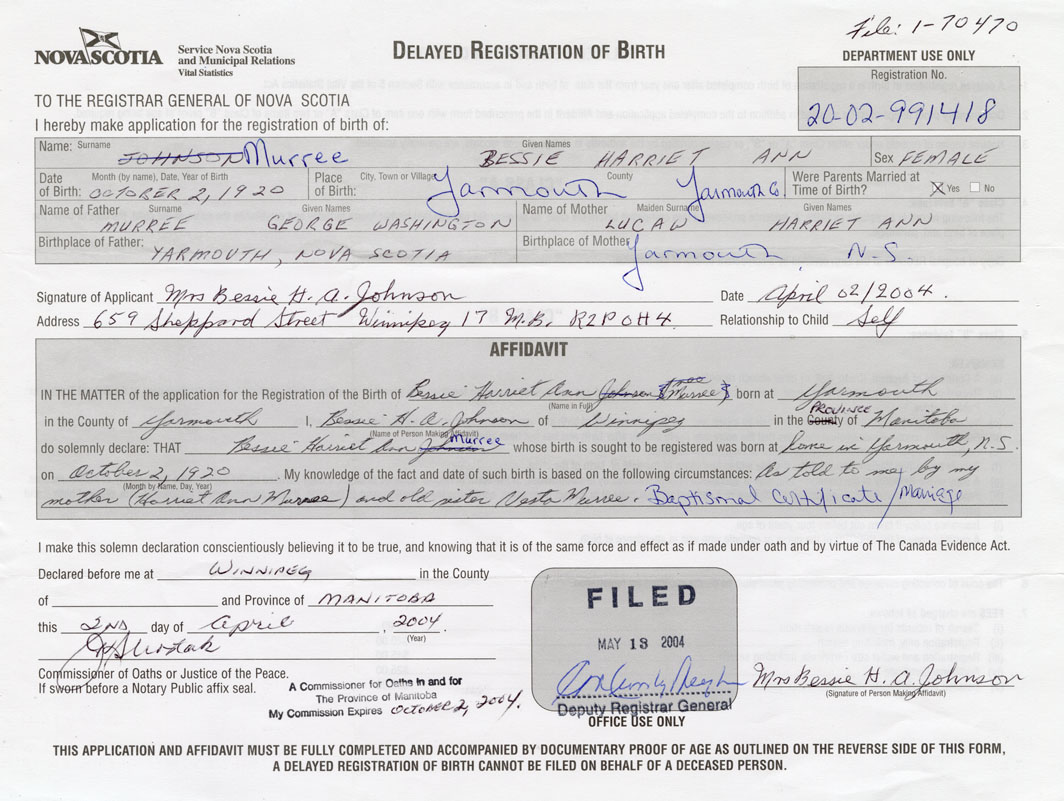 Signature of Applicant Bessie H.A. Johnson Address of Applicant Winnipeg Date April 2, 2004