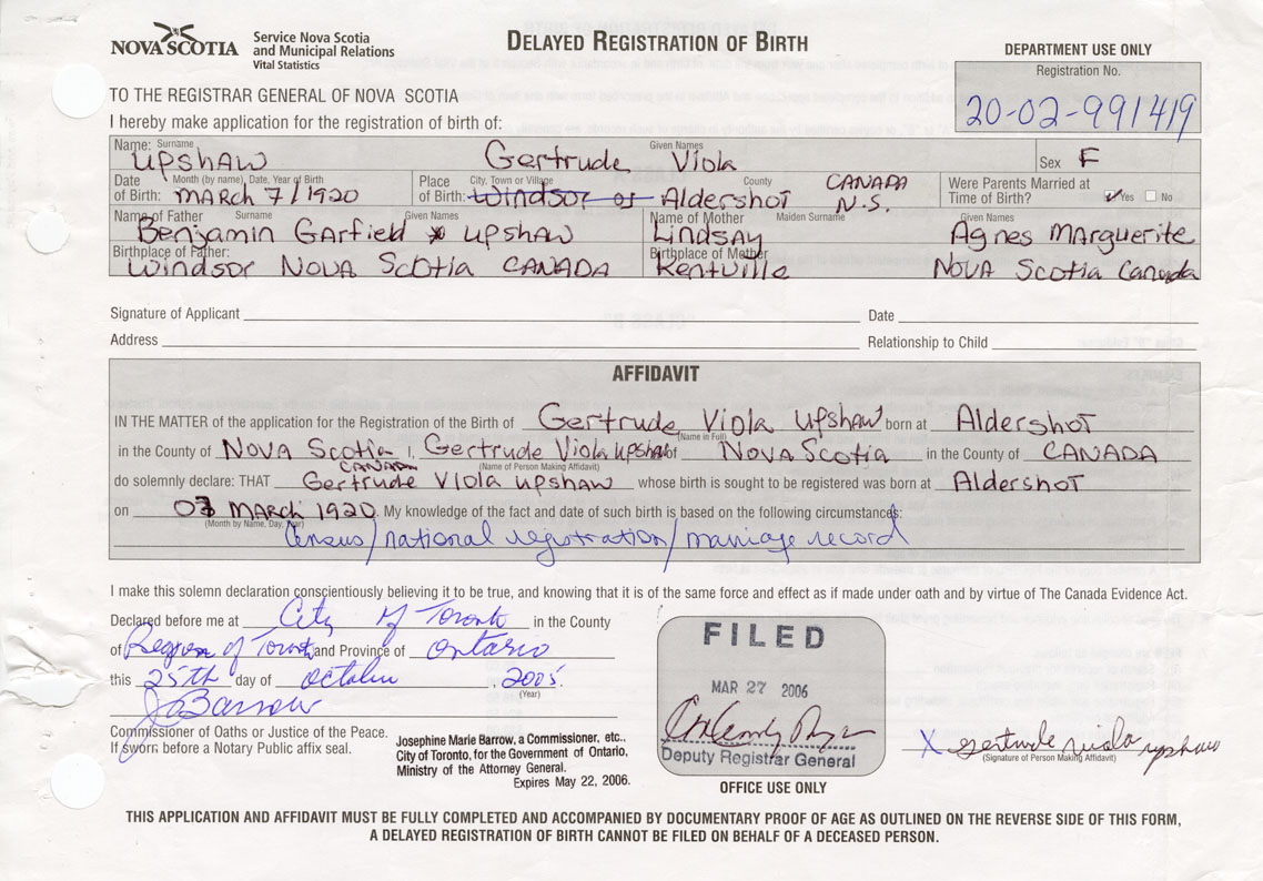 IN THE MATTER of the application for the Registration of the Birth of Gertrude ViolaUpshaw