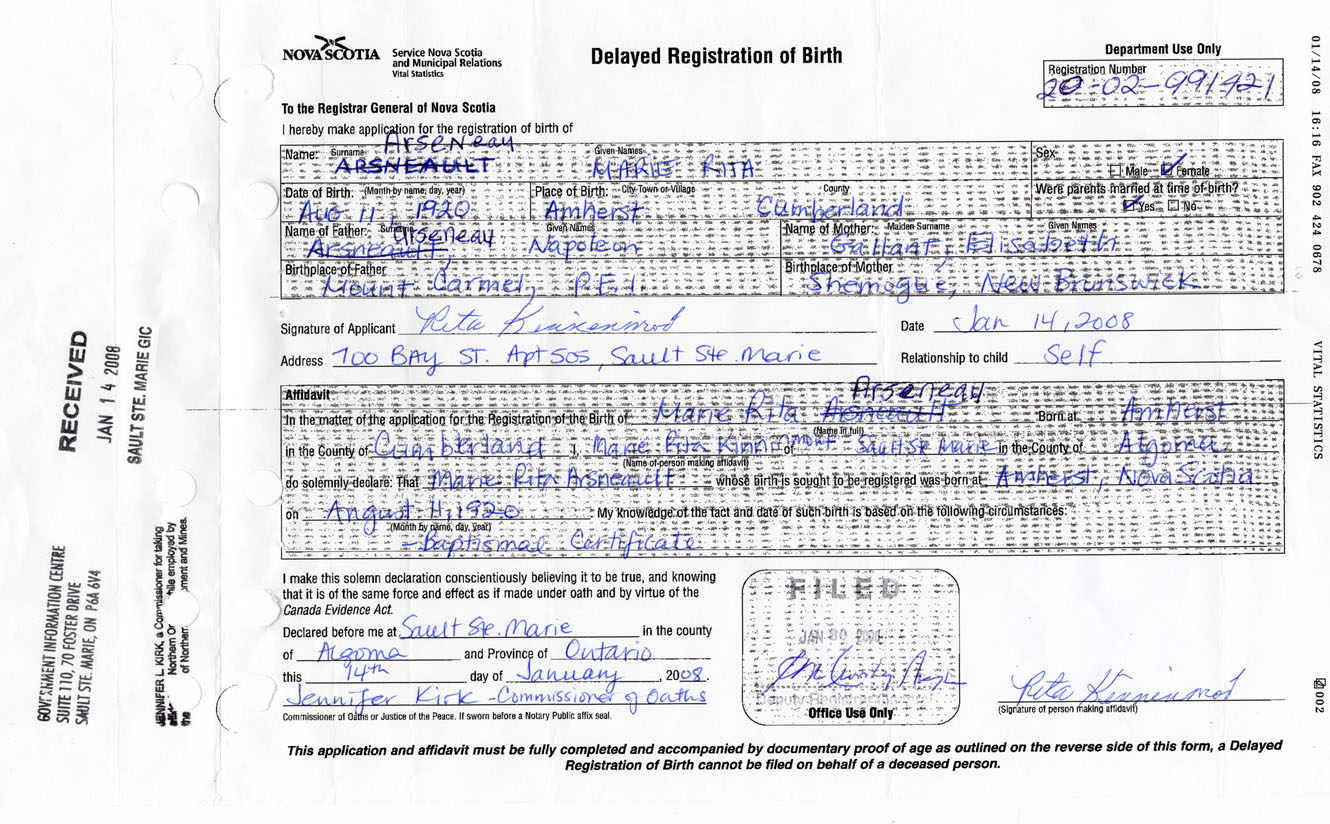 I hereby make application for the Registration of Birth of Marie RitaArseneau Sex Female