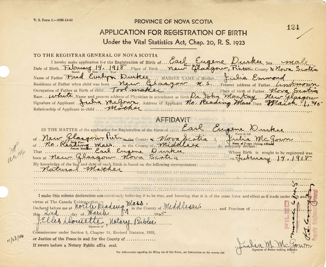 I hereby make application for the Registration of Birth of Earl EugeneDurkee Sex Male