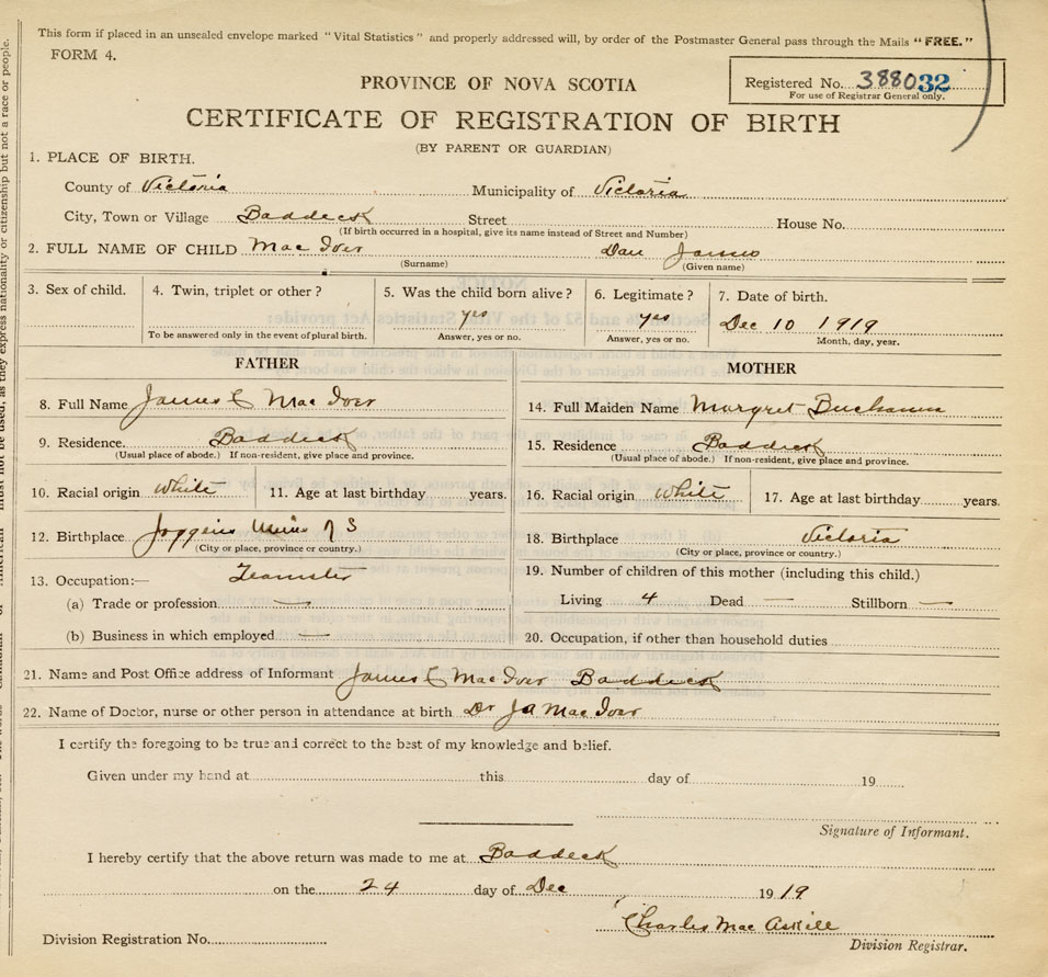22. Name of Doctor, nurse or other person in attendance at birth Dr. J.A. MacIver
