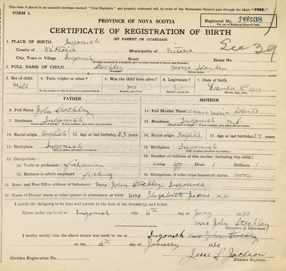 21. Name and Post Office address of Informant Mrs. John Stockley Ingonish
