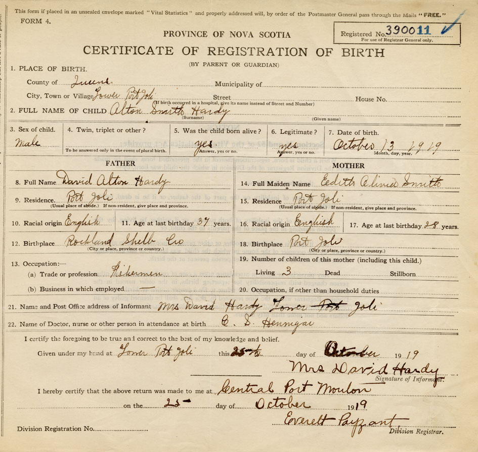 21. Name and Post Office address of Informant Mrs. David Hardy Lower Port Joli