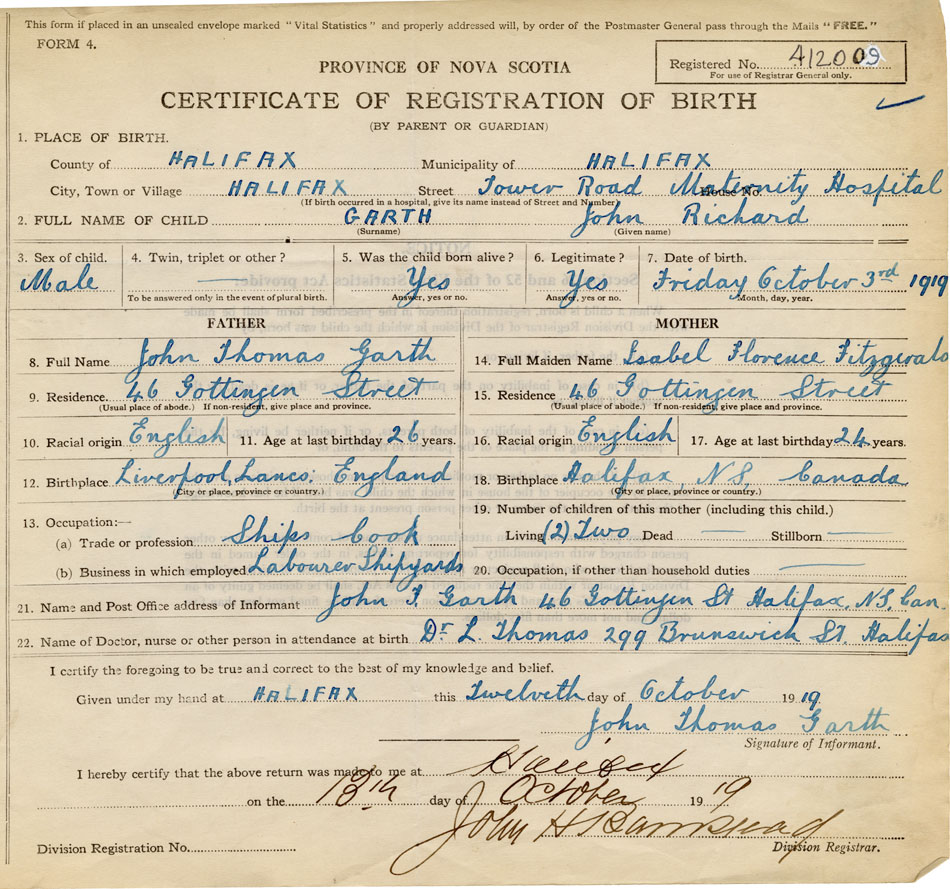 Residence of Father when child was born Halifax Present address of Father 46 Gottingen Street