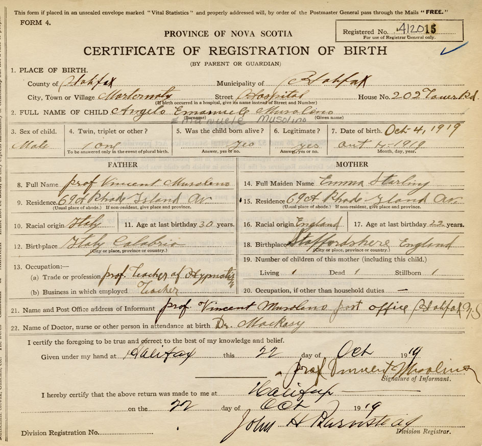 Name of Father Vincent Musolino MAIDEN NAME of Mother Emma Stirling