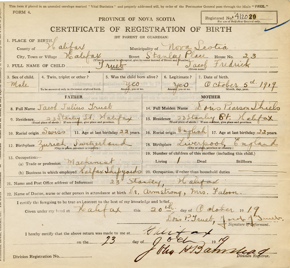 Occupation of Father at Birth of child Machinist for Halifax shipyards Place of birth of Father Zurich, Switzerland