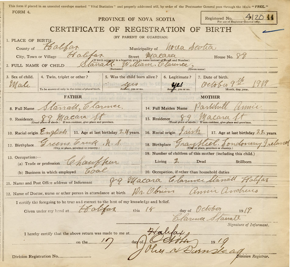 Occupation of Father at Birth of child Chauffeur Place of birth of Father Greens Creek, NS