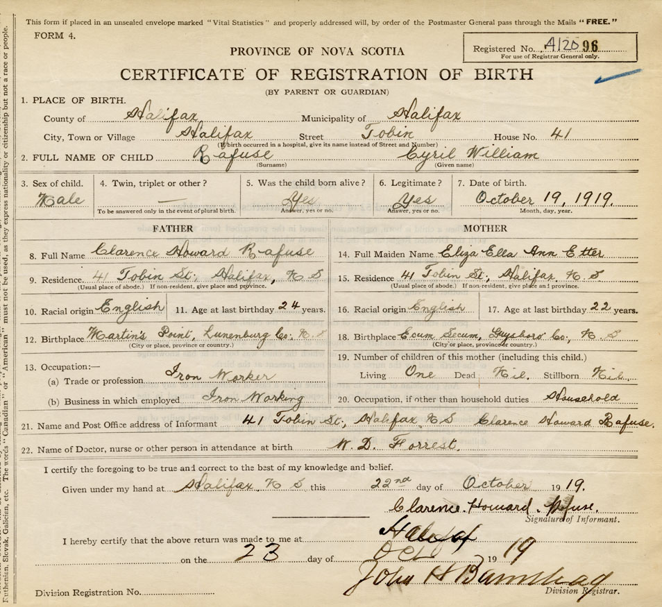 I hereby make application for the Registration of Birth of Cyril WilliamRafuse Sex Male