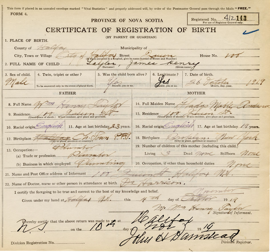 Residence of Father when child was born Halifax Present address of Father 100 Queen St.
