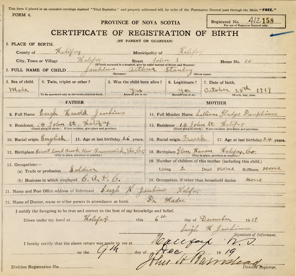 Name of Father Leigh Harold Jenkins MAIDEN NAME of Mother Lillian Gladys Dauphinee