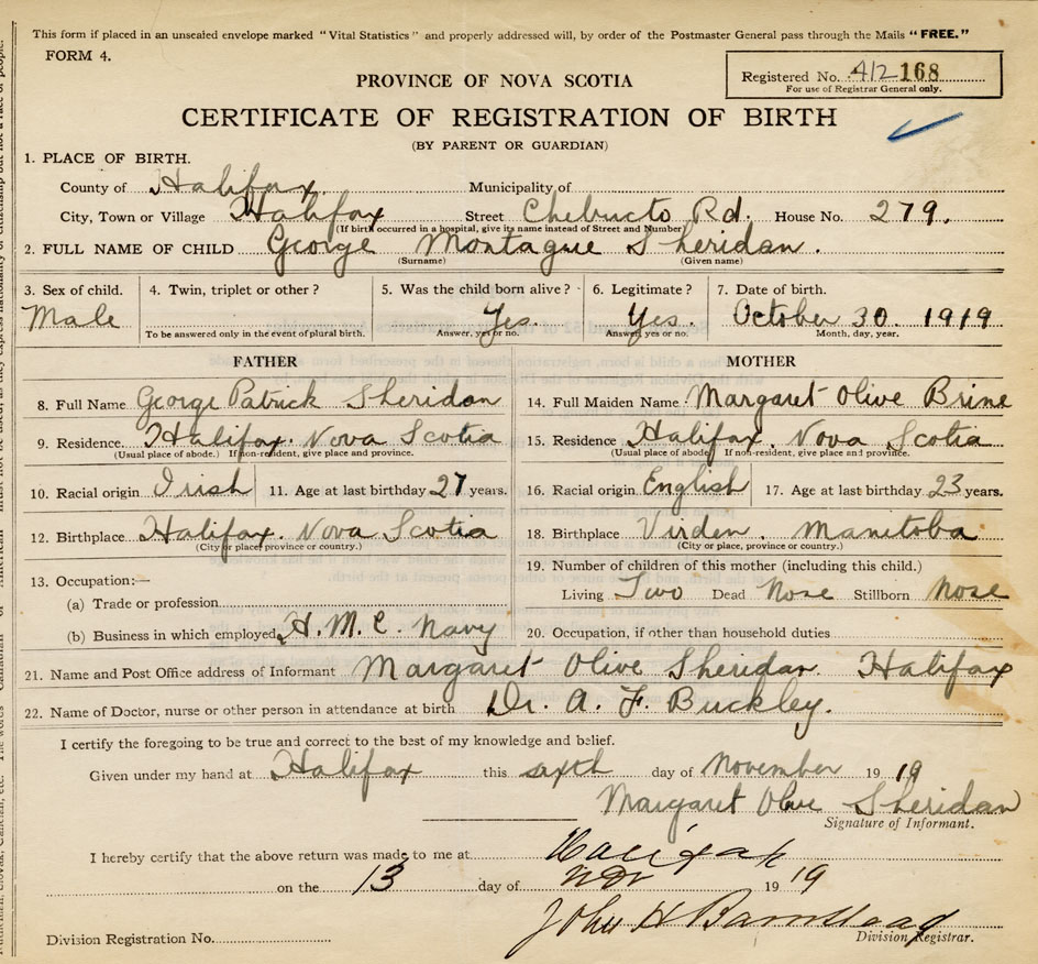 Occupation of Father at Birth of child Sailor, H.M.C. Navy Place of birth of Father Halifax