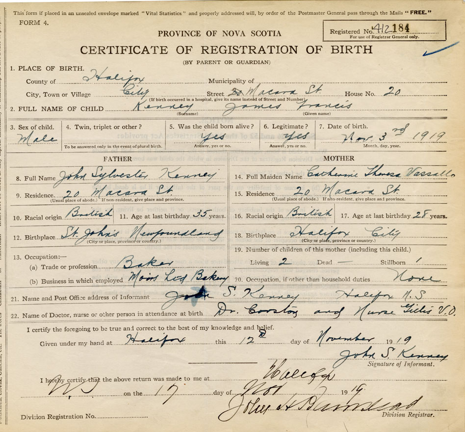 Signature of Applicant John S. Kenney Address of Applicant 20 Macara St., Halifax Date 12 November 1919