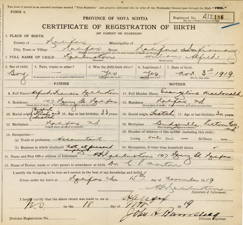 Name of Father Alfred Francis Haliburton MAIDEN NAME of Mother Evangeline MacDonald