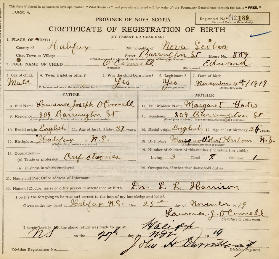 Residence of Father when child was born Halifax Present address of Father 809 Barrington St.