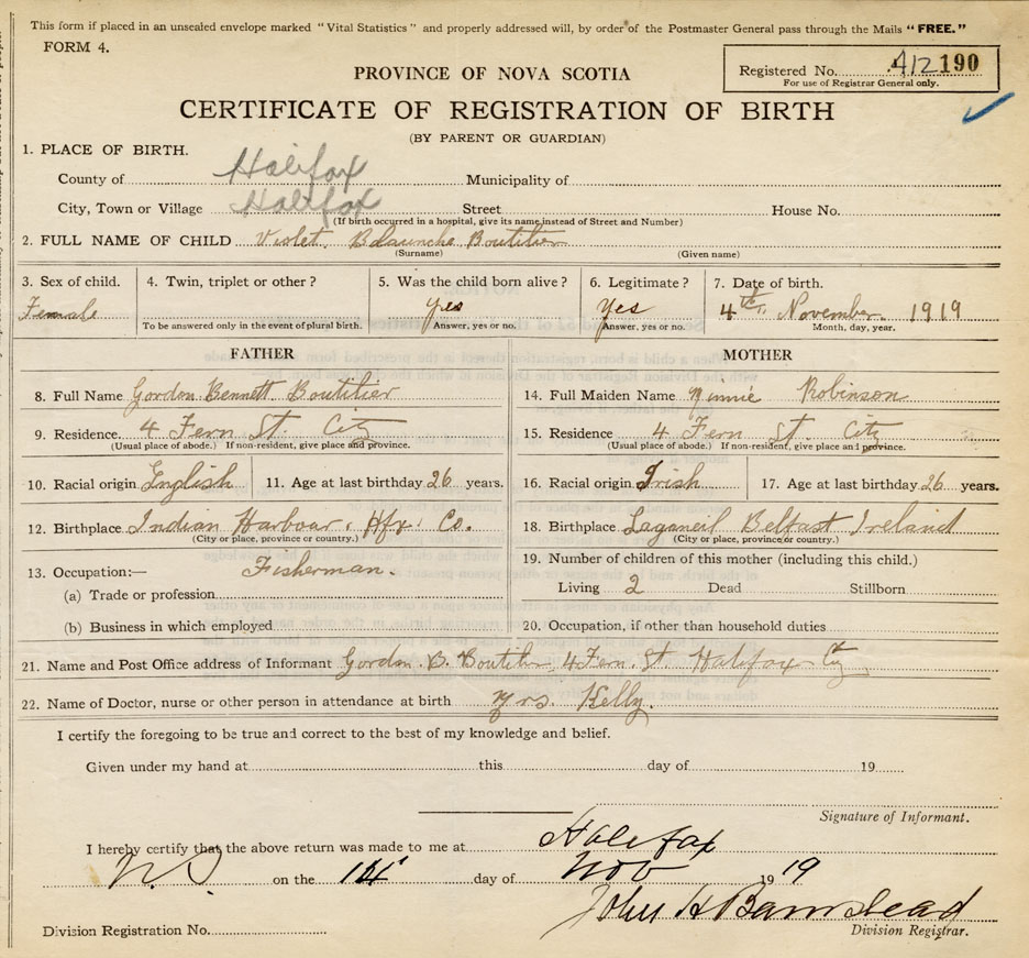 I hereby make application for the Registration of Birth of Violet BlancheBoutilier Sex Female