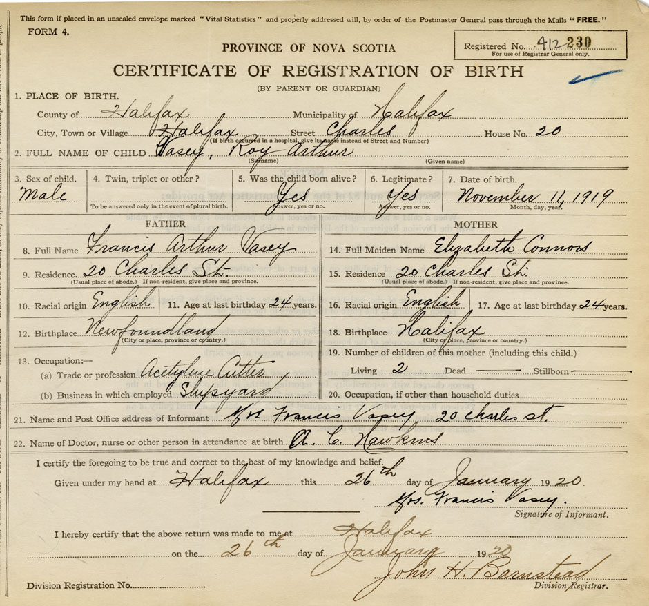 I hereby make application for the Registration of Birth of Roy ArthurVasey Sex Male