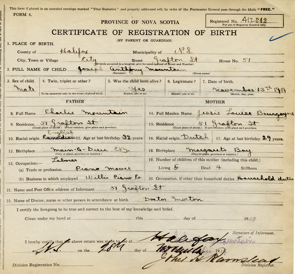Name of Father Joseph Anthony Mountain MAIDEN NAME of Mother Jessie Louise Bourgoyne