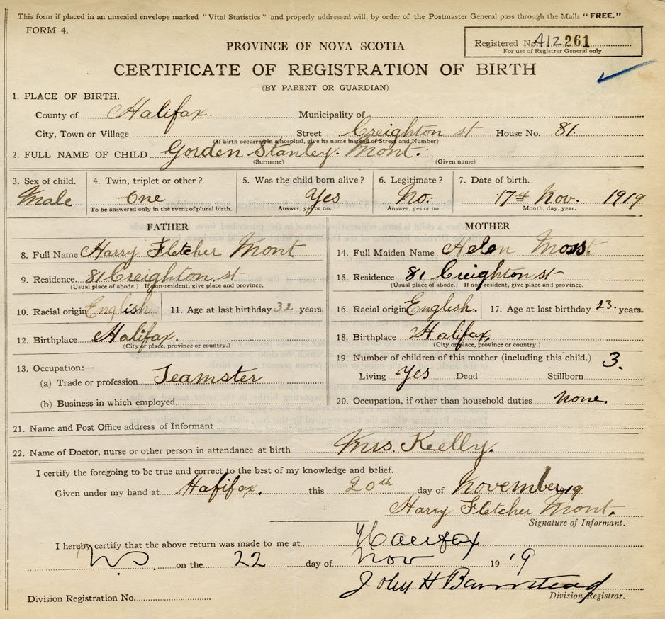 Residence of Father when child was born Halifax Present address of Father 81 Creighton Ave.