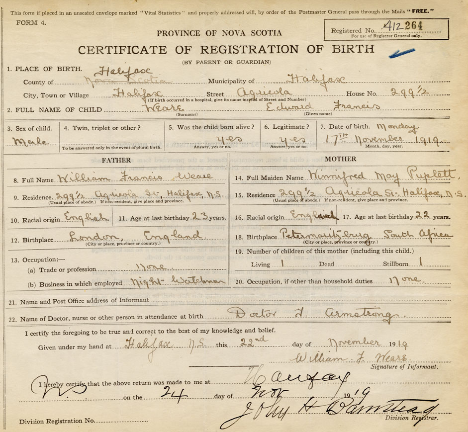 Name of Father William Francis Weare MAIDEN NAME of Mother Winnifred May Puplett