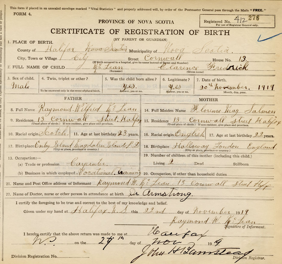Name of Father Raymond Wilfred MacLean MAIDEN NAME of Mother Florence May Salmon