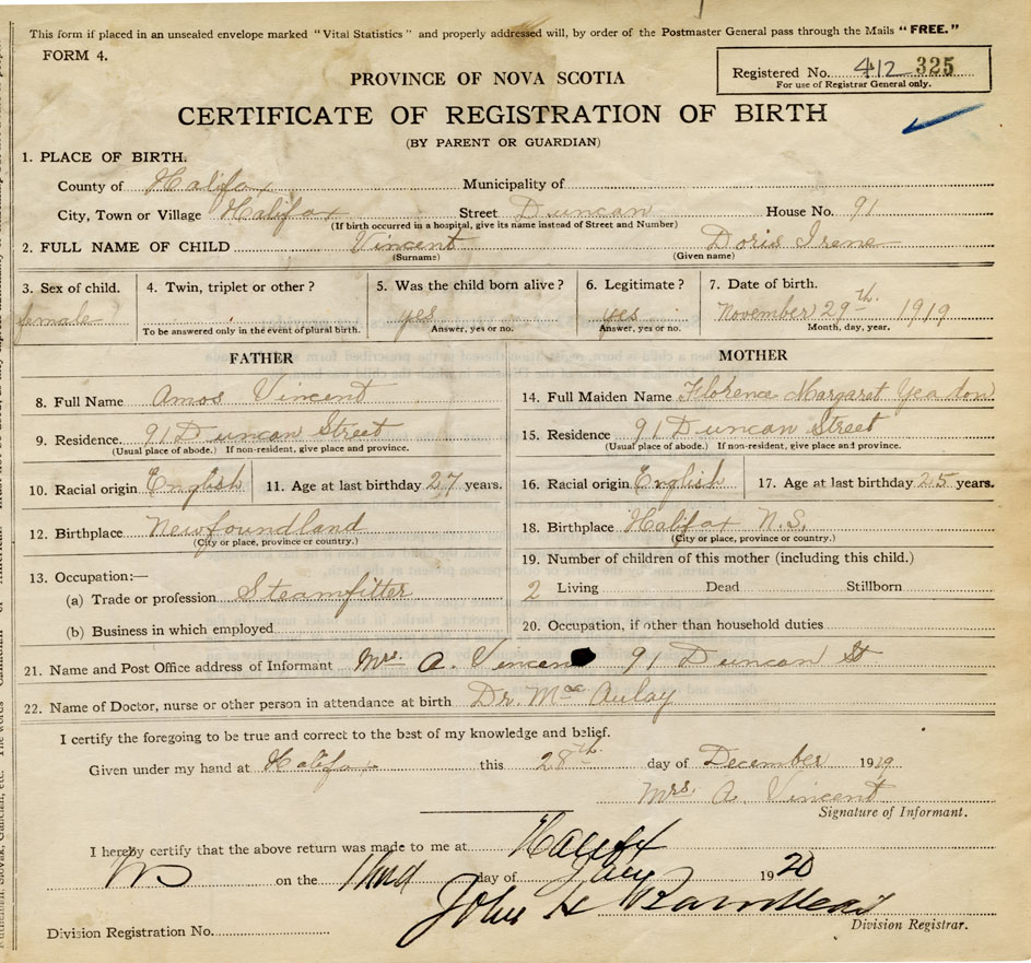 I hereby make application for the Registration of Birth of Doris IreneVincent Sex Female