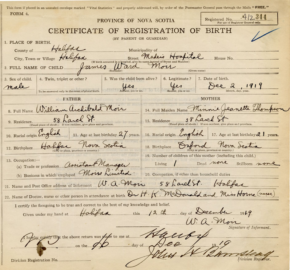 Name of Father William Archibald Moir MAIDEN NAME of Mother Minnie Jeanette Thompson