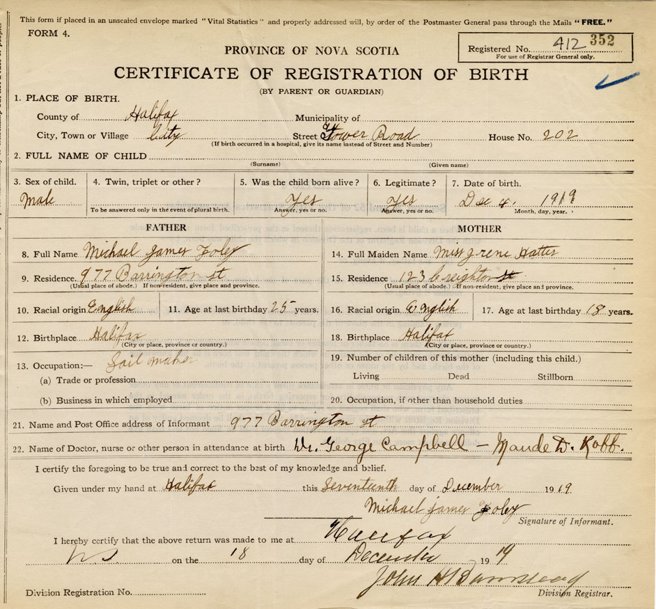 Signature of Applicant Michael James Foley Address of Applicant 977 Barrington St. Date 17 December 1919