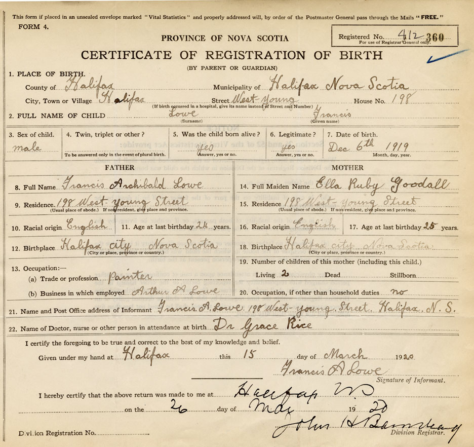 Name of Father Francis Archibald Lowe MAIDEN NAME of Mother Ella Ruby Goodall