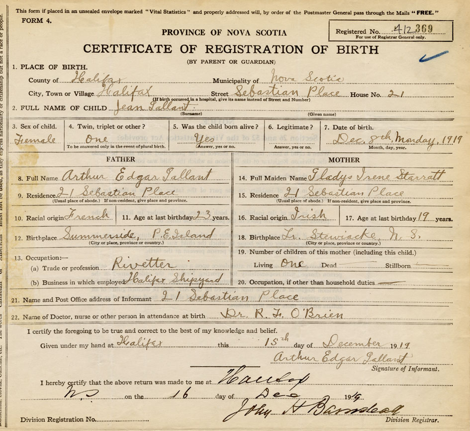 Name of Father Arthur Edgar Gallant MAIDEN NAME of Mother Gladys Irene Starratt