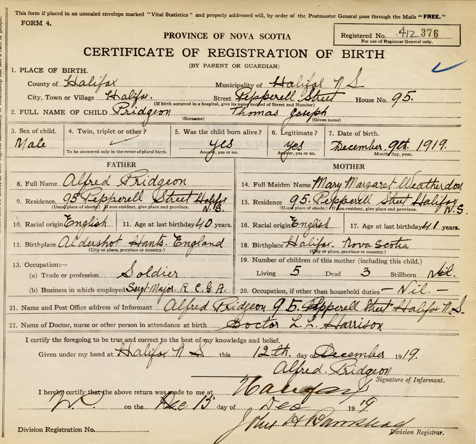 Signature of Applicant Alfred Pridgeon Address of Applicant Halifax Date 12 December 1919