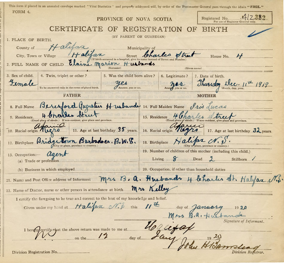 Name of Father Beresford Augustus Husbands MAIDEN NAME of Mother Iris Lucas