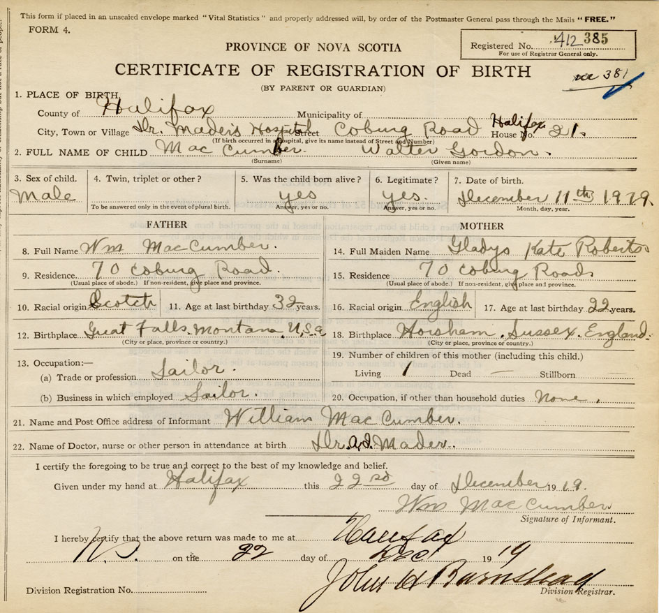 I hereby make application for the Registration of Birth of Walter GordonMacCumber Sex Male